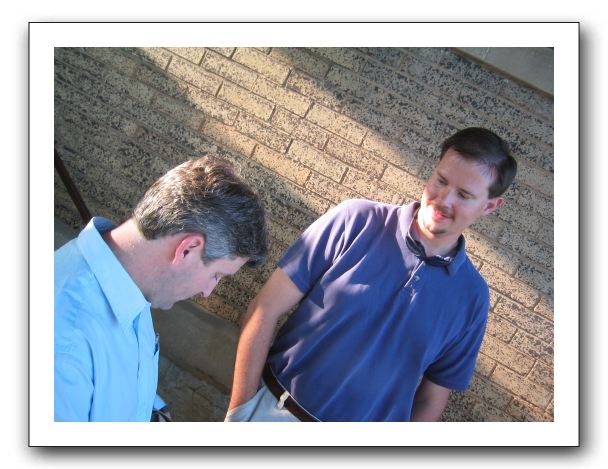 Carl Miller (left) is humbled by Jim Guthrie's giant-like height