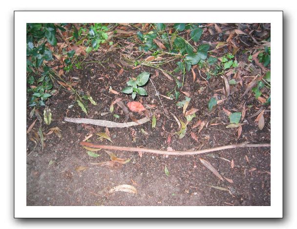 On path, a strip of bark, a fallen twig.