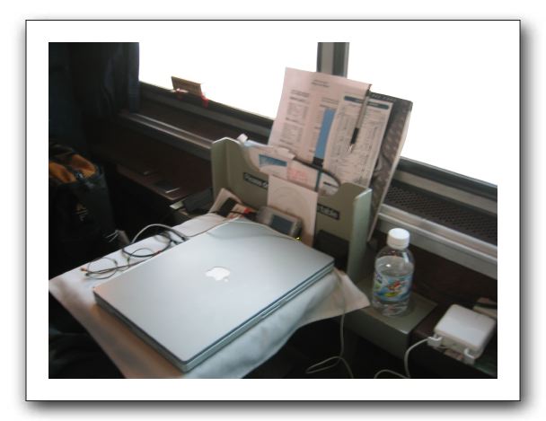 My little setup. PowerBook sitting on the table, with Treo 300 plugged into it, and adaptor plugged into powerstrip at bottom right.