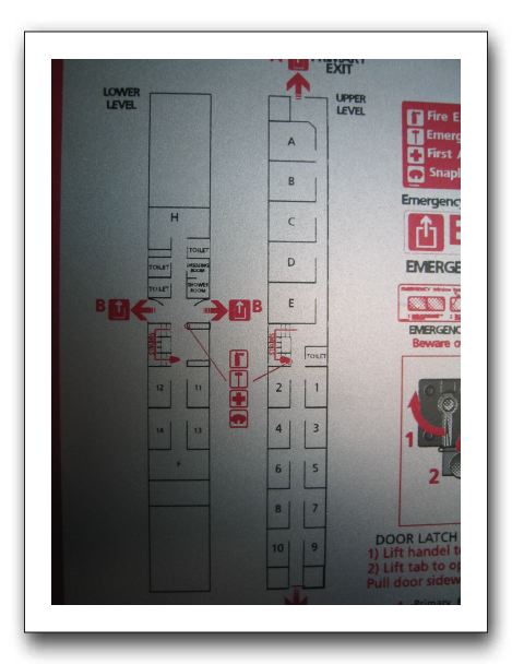 The emergency exits in my sleeper car. I'm in #12 (lower level).