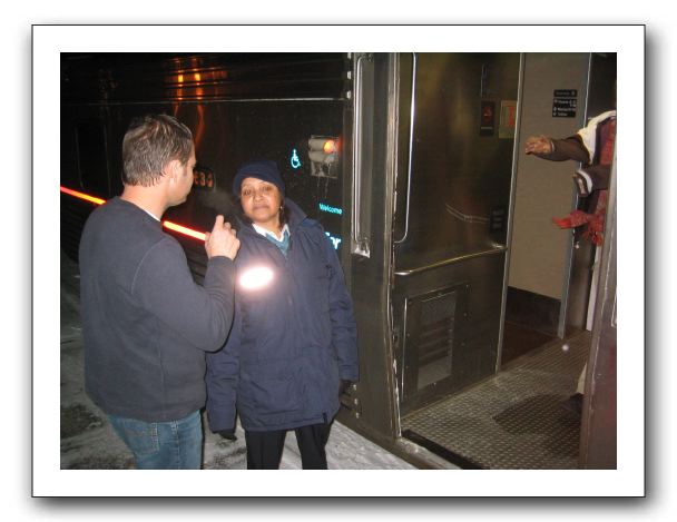 Ottumwa, Iowa. I step outside for a moment. In the jacket is Faye our Sleeping Car Attendant.