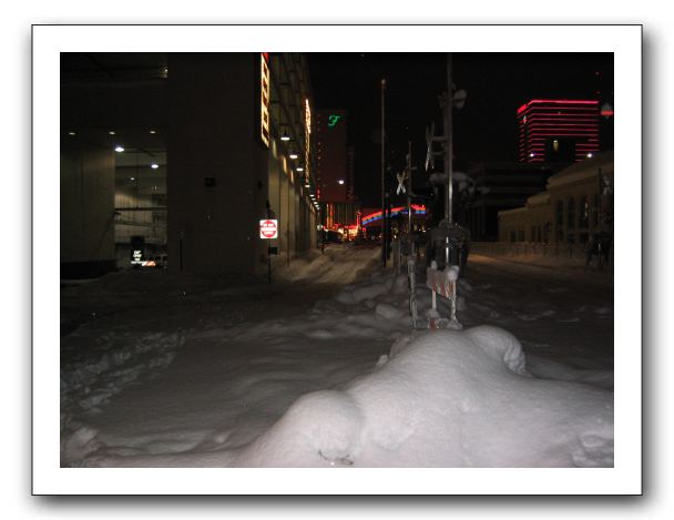 This is looking toward the hotel (see the green F on the building? Our hotel is about 2 blocks past that) one block from the station, all unplowed snowy streets and sidewalks